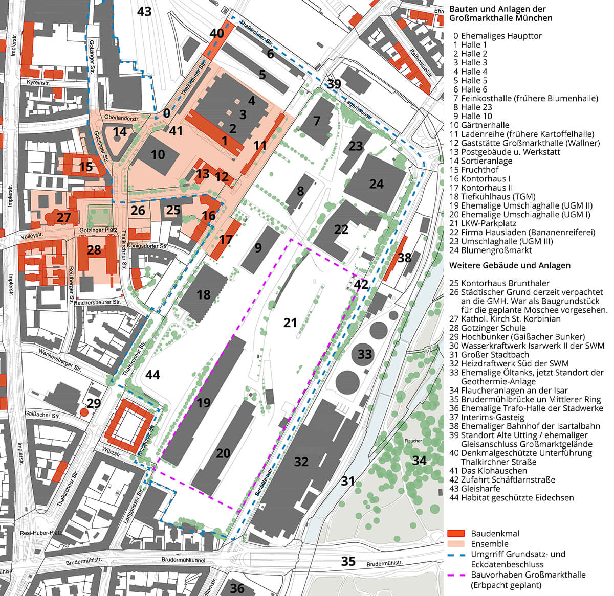 Die Eingangspforte Thalkirchner Straße/Oberländerstraße (Nr. 0) war bis in die 80er Jahre des vergangenen Jahrhunderts Hauptzufahrt zum Großmarktgelände. Sie ist heute für den Schwerlastverkehr gesperrt.